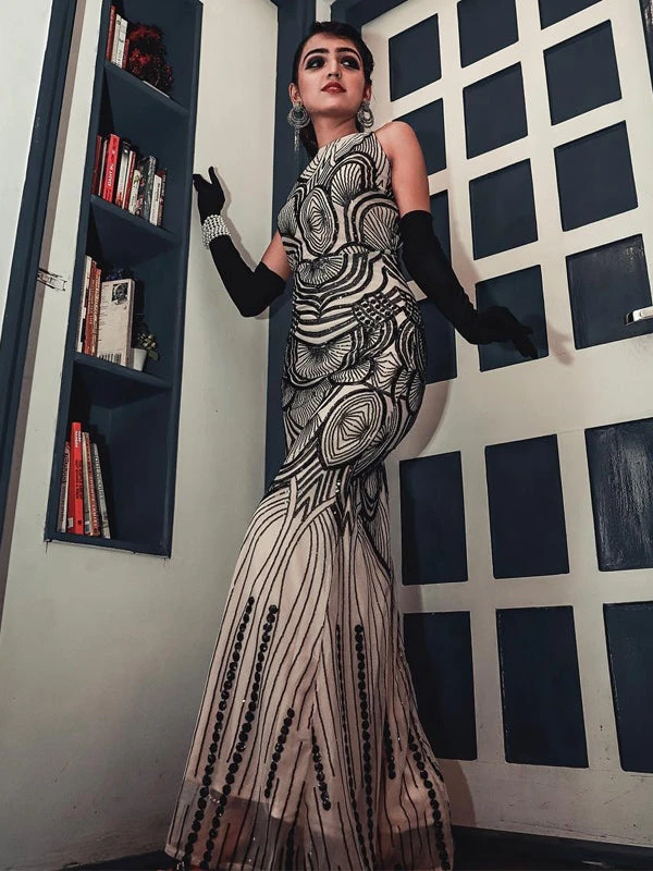 Your ticket to divinity, darlings! This Flapper Dress from Retro Stage is cast in an unstoppable 1920s-style cocktail dress that demands attention. With a classic halter neck, this angelic frock is complete with a sultry backless design. A twinkling array of black sequins curl throughout your feminine silhouette. Outfitted with a side zipper to flatter your feminine form, outshine the competition!