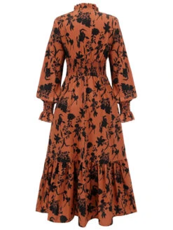 Orange 1950s Floral V-Neck High Waist Dress